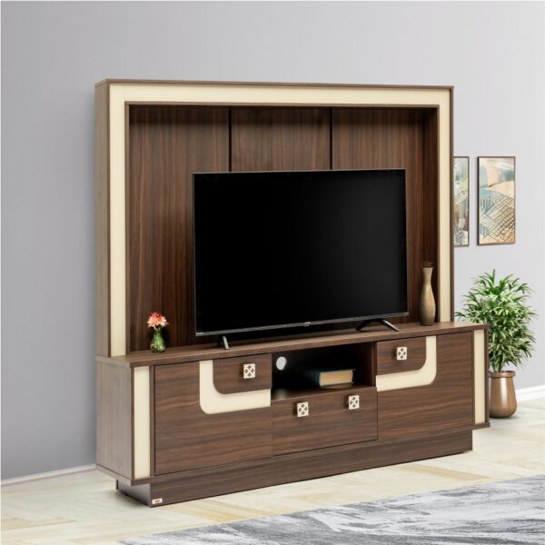 3. Unique two-tone tv unit with bottom storage.